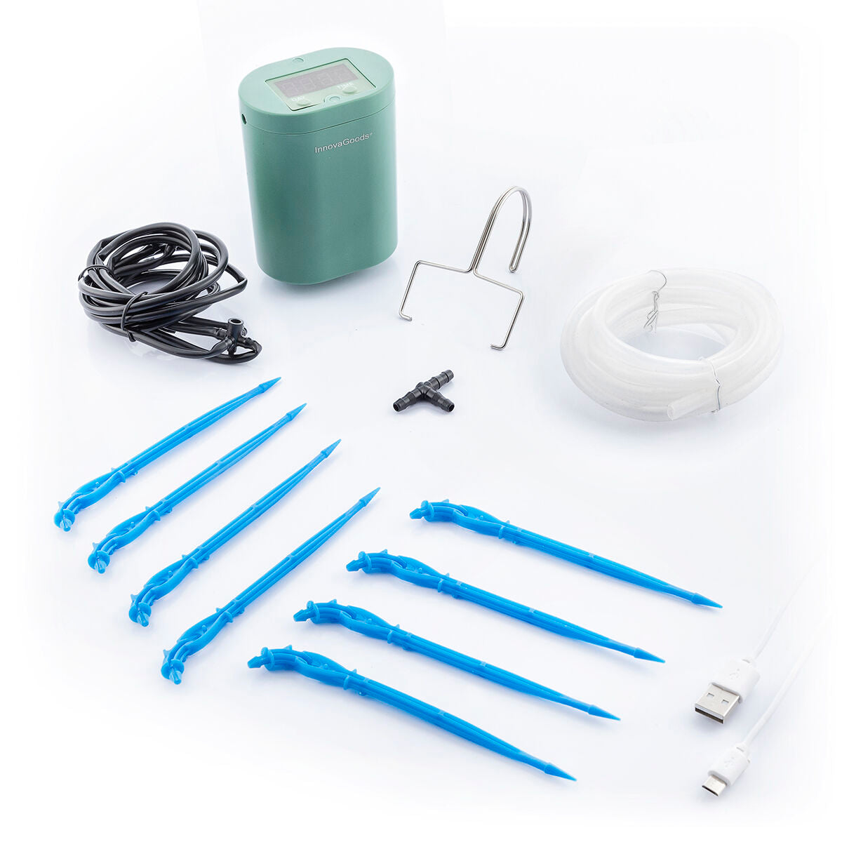 Un originale e completo sistema di irrigazione a goccia automatica per vasi che permette di innaffiare fino a 8 piante contemporaneamente in modo semplice e comodo. Oltre a risparmiare acqua, tempo e fatica, evita il fastidio di dover innaffiare le piante manualmente e di persona, il che è un grande aiuto per svolgere questo compito in modo più facile e sicuro, senza dimenticarsene o essere sopraffatti, regolarmente o durante le vacanze, ecc. Questo dispositivo di irrigazione è ricaricabile (include un cavo di ricarica da USB a micro USB) e programmabile, in quanto ha un timer digitale per indicare l'intervallo di giorni di irrigazione (da 1 a 9 giorni) e la durata dell'irrigazione desiderata in secondi. Il set include il gancio di metallo per il dispositivo elettrico, l'accessorio connettore triplo (T), la pompa e i tubi di irrigazione e 8 picchetti di irrigazione da inserire nel terreno di ogni vaso. È facile da installare seguendo le istruzioni di montaggio incluse. Il suo raggio d'azione è di 1200 ml/min (±100 ml) e la temperatura di funzionamento è compresa tra 5 e 50 °C. Permette anche l'irrigazione manuale per mezzo di uno dei pulsanti sul dispositivo. Non include serbatoio d'acqua per l'irrigazione.